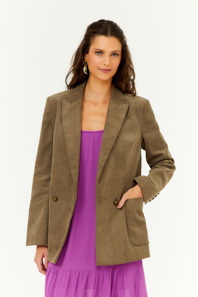 O Blazer Veludo Cotelê com Bolsos é peça protagonista que imprime sofisticação imediata às produções. O veludo cotelê confere textura rica e encorpada, criando profundidade e brilho discreto ao visual. A modelagem estruturada, com lapela clássica e bolsos utilitários, une elegância e praticidade em uma só peça. Atemporal e versátil, acompanha desde combinações de alfaiataria até sobreposições casuais com jeans, traduzindo a força suave do feminino em cada detalhe.