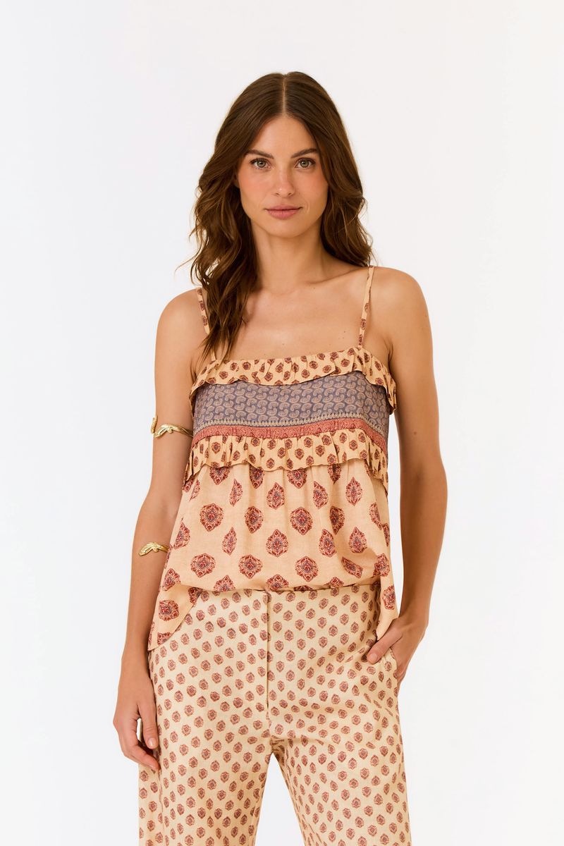 Blusa Alça Estampa Haze é peça de alças reguláveis com estampa que mistura padrões e barrados, babado no decote que cria leve movimento e modelagem fluida que valoriza com naturalidade.