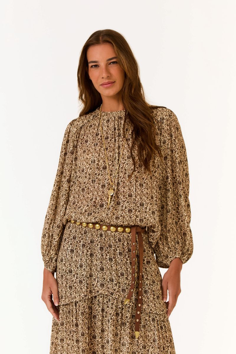 A Blusa Estampa Gerânio é um convite à leveza e ao frescor do verão, trazendo a estampa floral que se mistura a fios de lurex, criando um efeito luminoso sutil. O modelo ganha ainda mais sofisticação com o drapeado delicado no decote e o fechamento com botão discreto na parte de trás, que valoriza a silhueta e garante acabamento refinado. Uma peça que traduz a força suave do feminino com naturalidade e fluidez, perfeita para acompanhar diferentes momentos do dia.