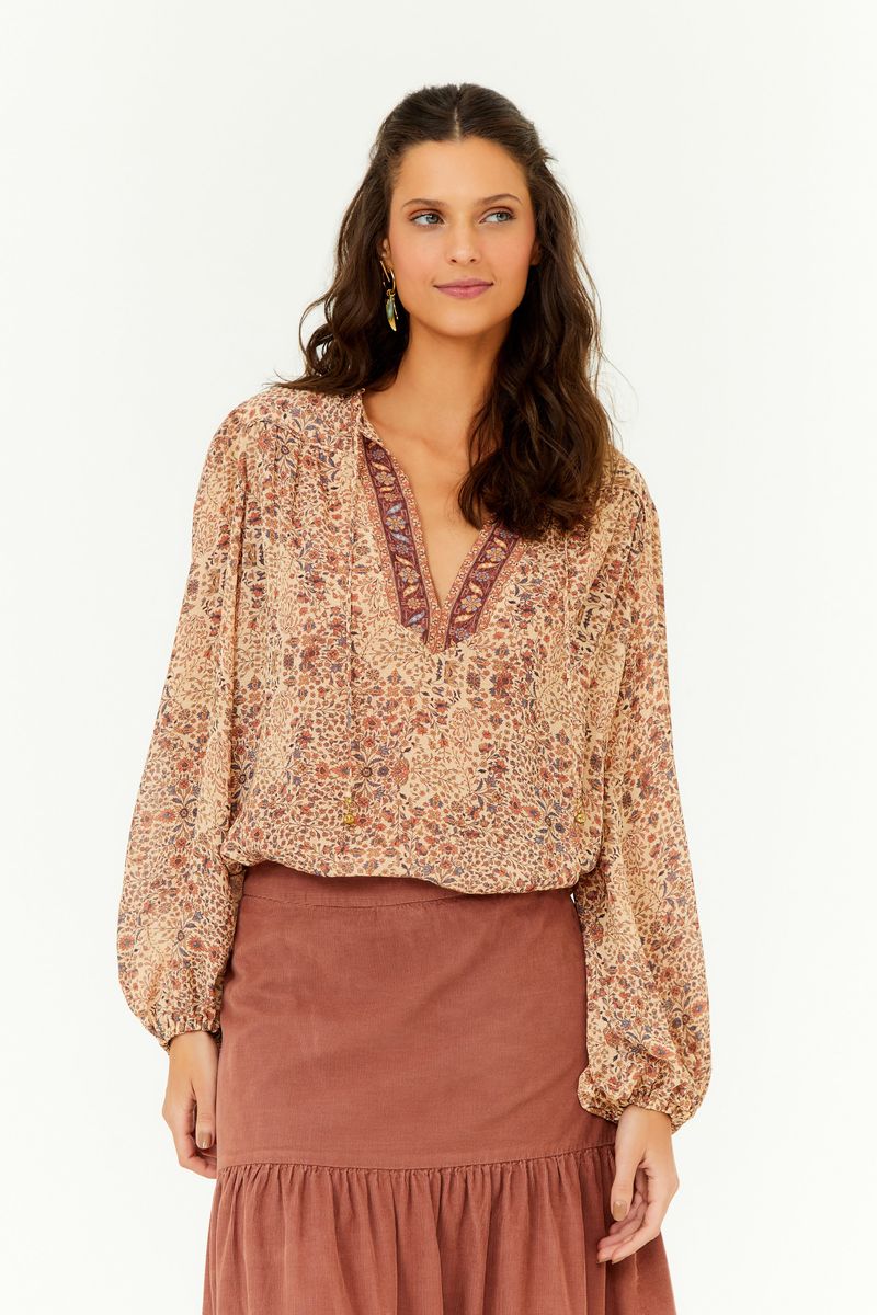 - Use com calça pantalona terracota para valorizar os tons quentes do print.