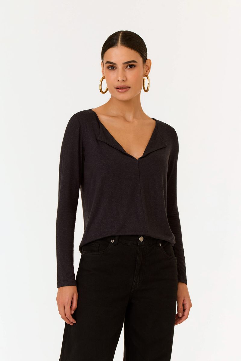 A Blusa Manga Longa Dobradura Decote combina conforto e elegância com um toque autoral. O detalhe em dobradura no decote valoriza a região com sutilidade, enquanto a textura da malha mescla viscose e linho, trazendo frescor e versatilidade ao dia a dia.