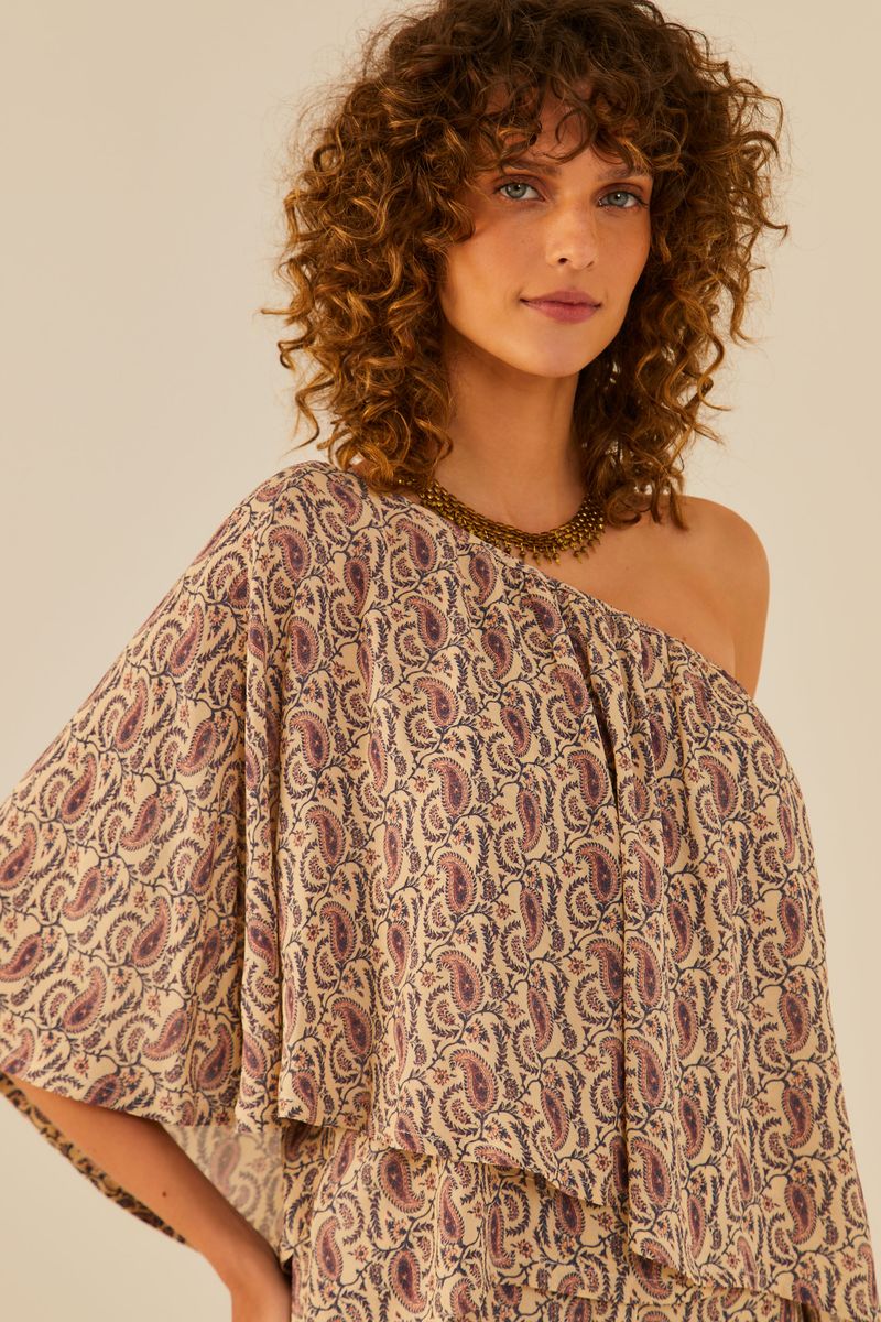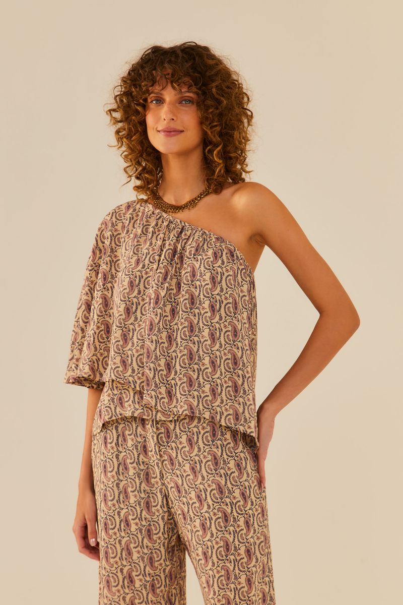 A Blusa Um Ombro Só GGT Estampa Mumbai é a personificação do estilo sofisticado e atemporal. Feita em 100% viscose, apresenta a estampa Mumbai, com a clássica padronagem Paisley em cores neutras. Seu design especial inclui um babado godê fluido, decote de um ombro só e um corpo alongado, proporcionando um visual elegante e moderno. Perfeita para combinar com calças jeans ou outras peças da mesma estampa, essa blusa é uma escolha versátil para diversas ocasiões. Complete o look com uma gargantilha para um toque final de estilo.