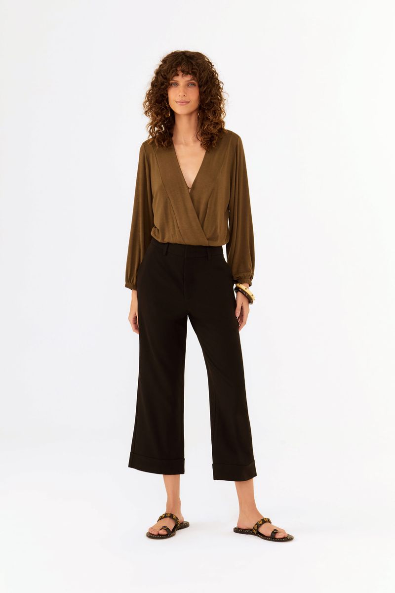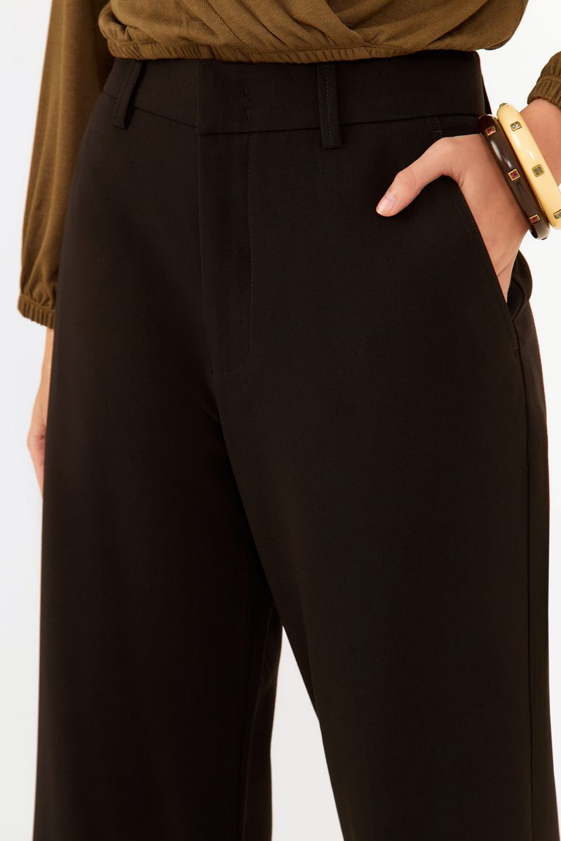 - Modelagem de alfaiataria com cintura alta.
