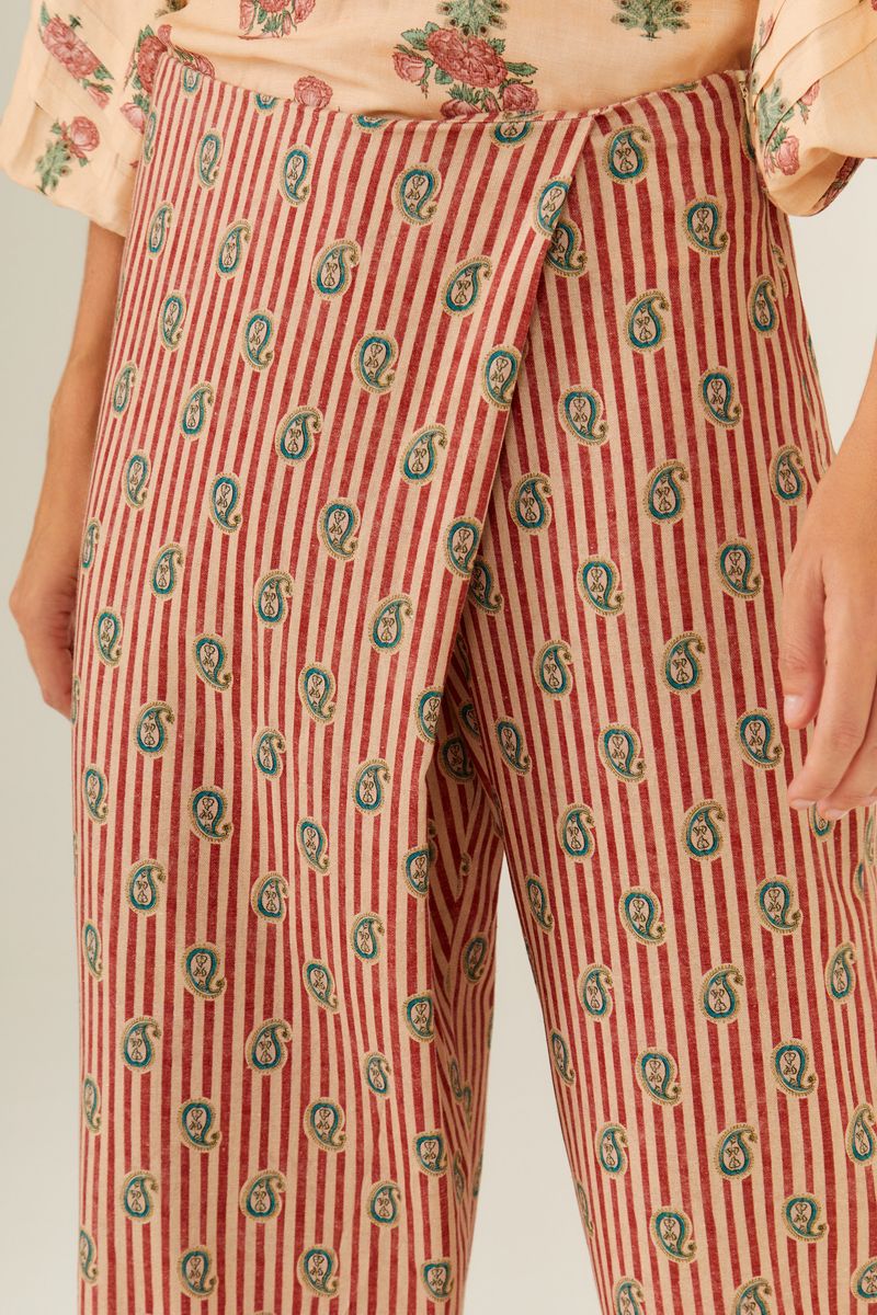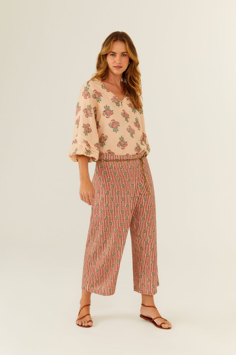 - Use acessórios neutros para destacar a estampa vibrante da calça.