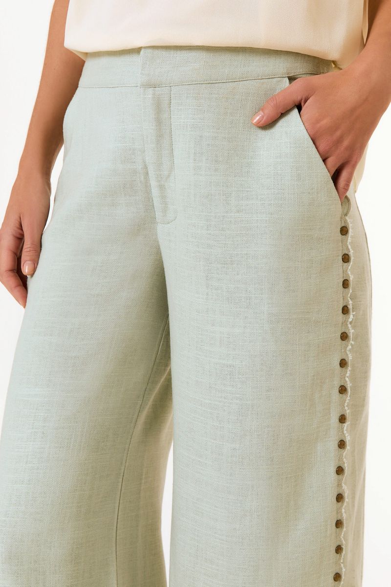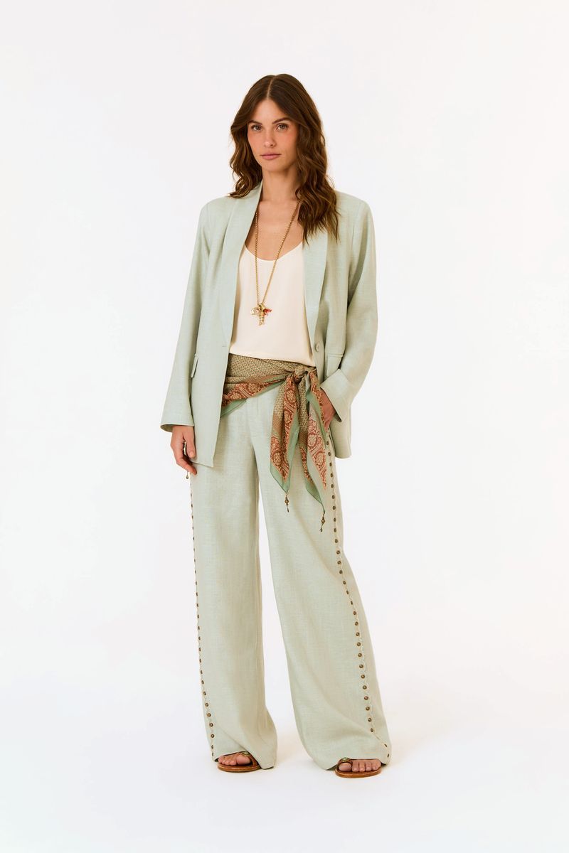 Calça Festonê Lateral é de corte reto em viscose e linho, com caimento fluido que acompanha o corpo com naturalidade. O festone lateral com tachas arredondadas traz um detalhe artesanal, e o cós com acabamento limpo reforça a proposta refinada e confortável.