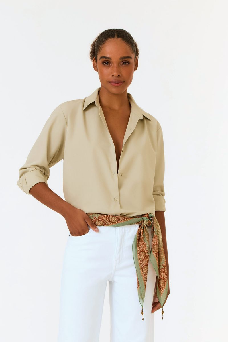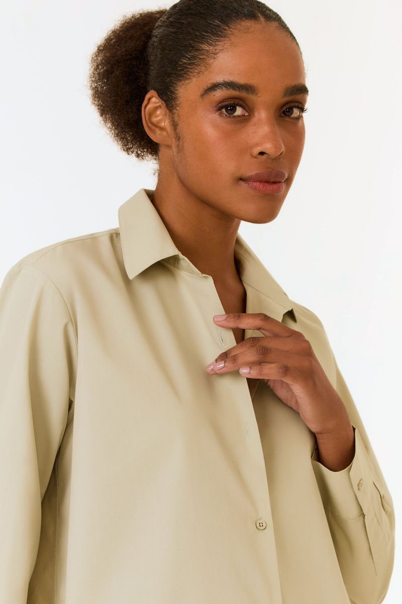 Camisa Botões é a peça essencial que equilibra presença e leveza, com colarinho clássico, abotoamento frontal e mangas que podem ser dobradas para variar o volume. A modelagem levemente ampla permite combinações com camadas e contrastes de proporção.