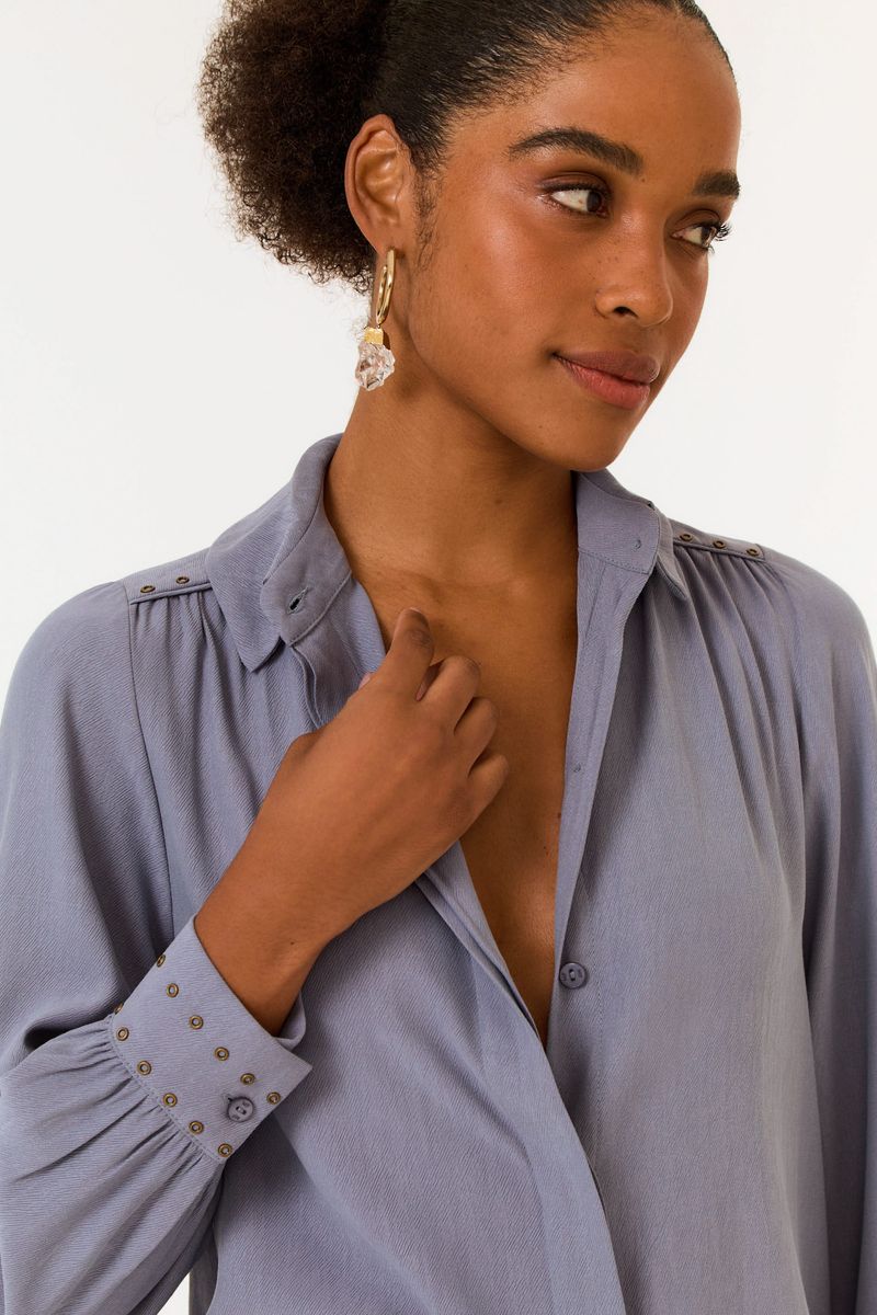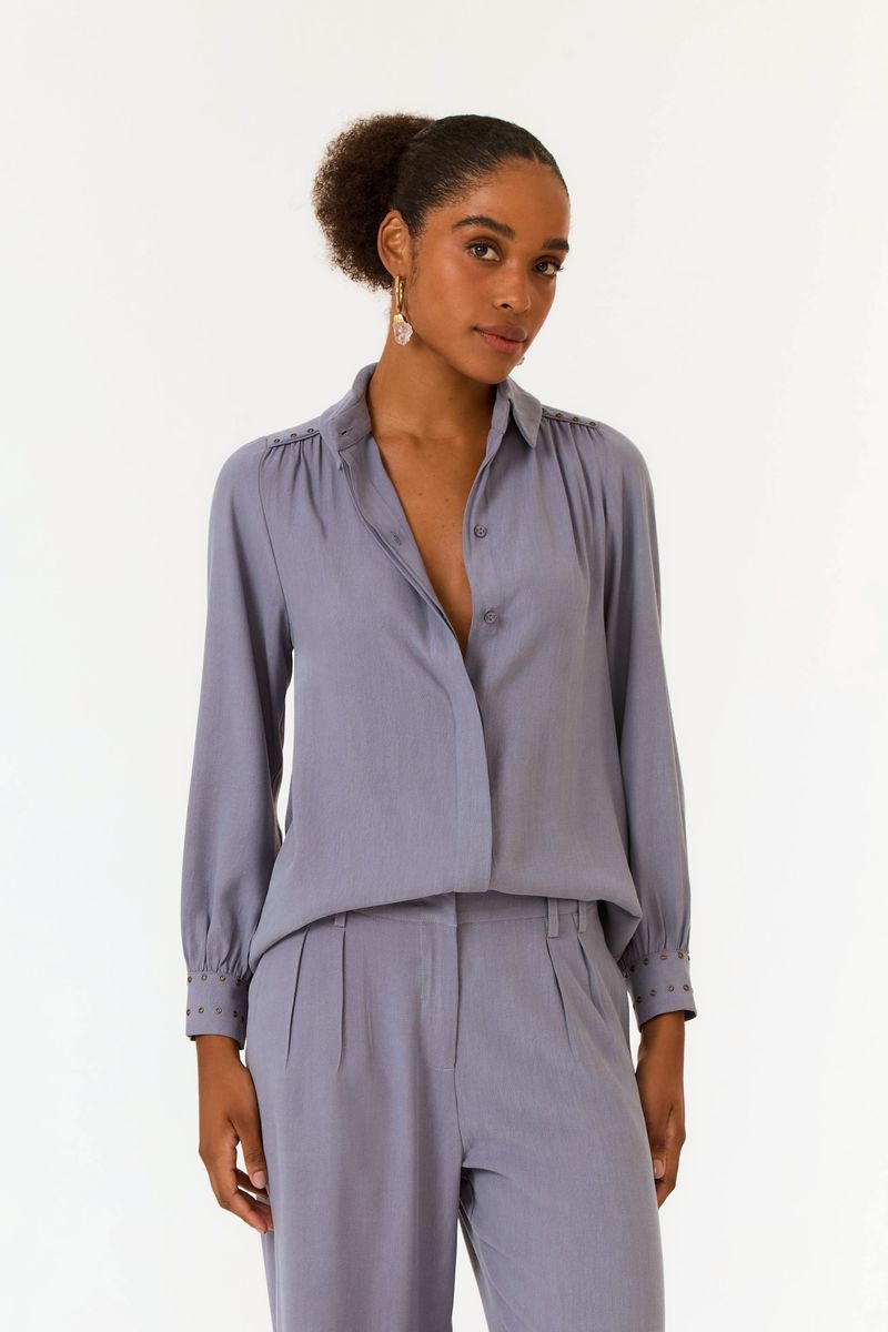 • Tecido plano de liocel com viscose • Detalhe de tachas nos punhos e ombros • Manga longa com abotoamento nos punhos • Gola clássica • Caimento fluido e confortável • Fechamento frontal com botões ocultosDicas de styling