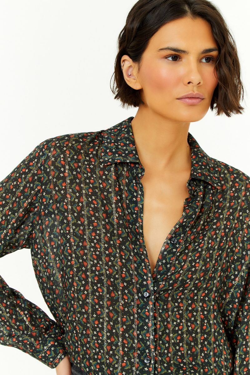 Camisa Estampa Serena é a síntese do easy-chic com frescor. A modelagem ampla e o caimento fluido reforçam o conforto, enquanto a estampa exclusiva, somada ao brilho sutil do lurex, adiciona sofisticação. O abotoamento frontal e a gola clássica trazem atemporalidade, equilibrando design autoral e versatilidade. Uma peça que se adapta a diferentes ocasiões, do trabalho ao lazer, sempre com elegância natural.