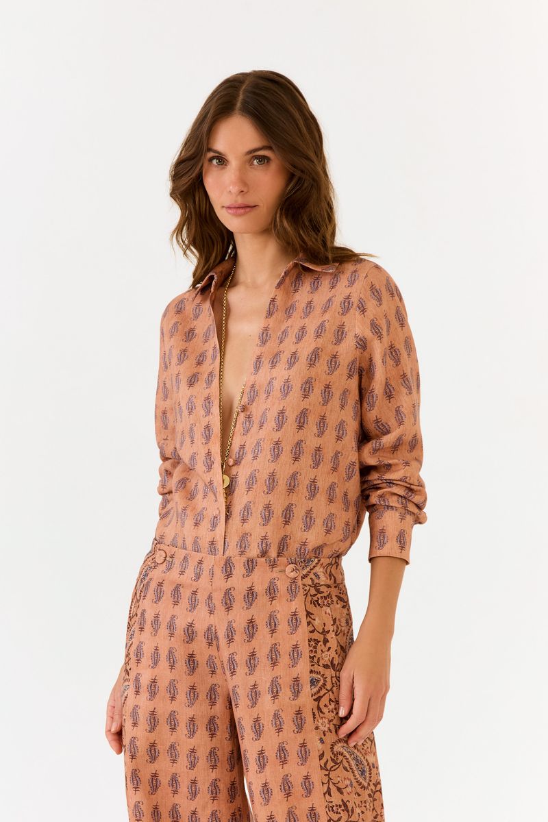 A Camisa Linho Estampa Hippie Compose Ginger traduz a essência do boho sofisticado da temporada, unindo o frescor natural do linho à força de um design atemporal. Sua estampa exclusiva em tom rosado e terroso reforça a conexão com a natureza, enquanto os botões forrados na frente e nos punhos elevam o acabamento da peça, revelando atenção minuciosa aos detalhes. O tecido mais encorpado garante um caimento estruturado, perfeito para valorizar produções que transitam do dia para a noite com fluidez e elegância. Uma peça que carrega leveza e personalidade, pensada para mulheres que buscam autenticidade em cada escolha.