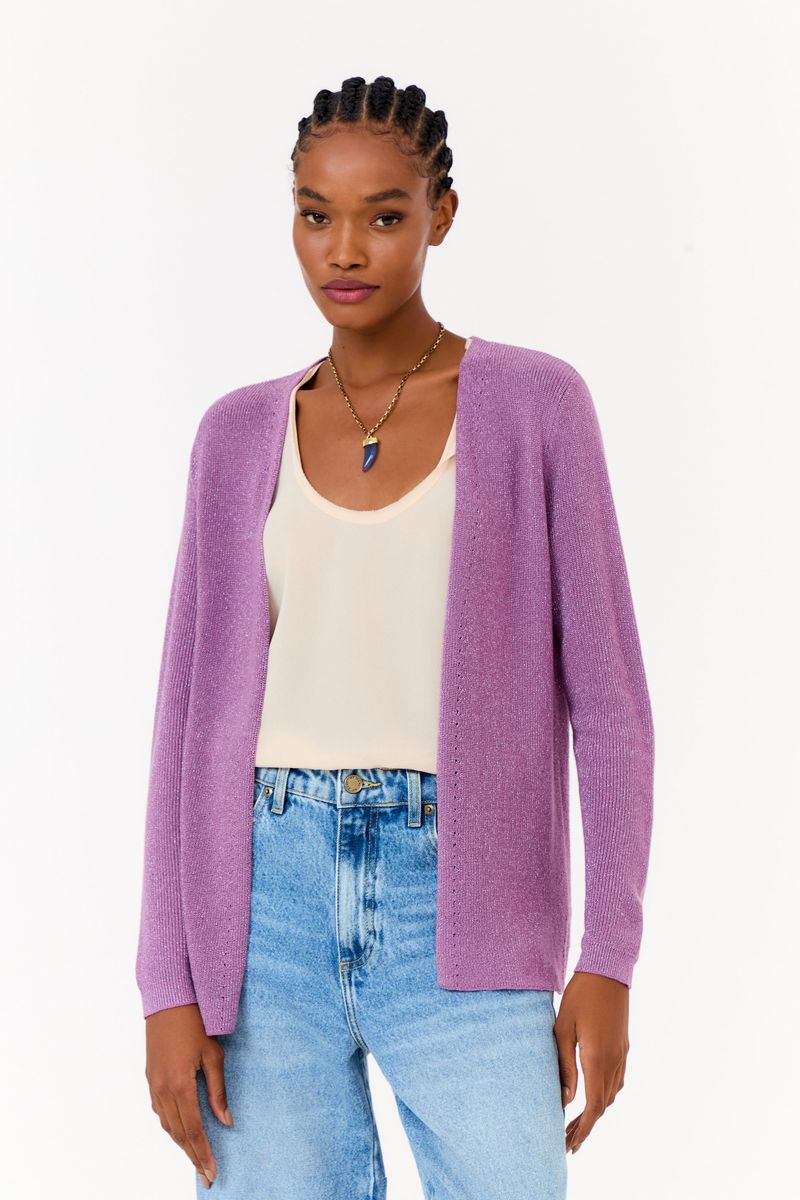 O Cardigan Tricot Detalhe Fenda Lateral traz a proposta de uma terceira peça versátil e atemporal, que acrescenta sofisticação ao visual de forma sutil. Confeccionado em tricot com fios de lurex, ele garante leve brilho em movimento e adiciona um toque refinado ao look. A modelagem reta com pequenas fendas laterais confere liberdade ao vestir, enquanto a elasticidade natural do tricot assegura conforto em qualquer ocasião. Ideal para transitar entre o dia e a noite, esta peça traduz o conceito easy-chic da Maria Filó, equilibrando elegância e praticidade.