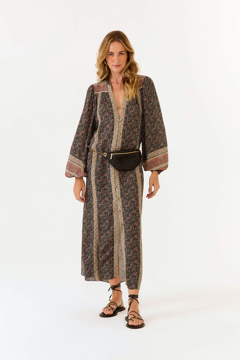 O V Chemise GGT Estampa Isla Preto é uma peça que une leveza e sofisticação em uma proposta versátil para diversas ocasiões. Com estampa exclusiva em diferentes barrados e mangas ajustadas nos punhos, seu caimento fluido traz frescor e elegância. Os botões forrados e a fenda lateral completam o visual com delicadeza e movimento.