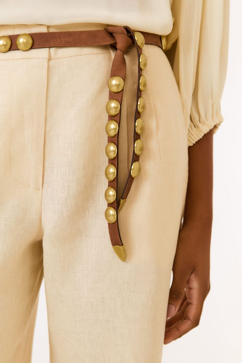 O Cinto Couro Amarração Chatons Dourados valoriza a silhueta com charme e personalidade. Os chatons dourados trazem um brilho sutil e elegante, enquanto o fechamento por amarração permite um ajuste versátil, que acompanha diferentes propostas de look com leveza.