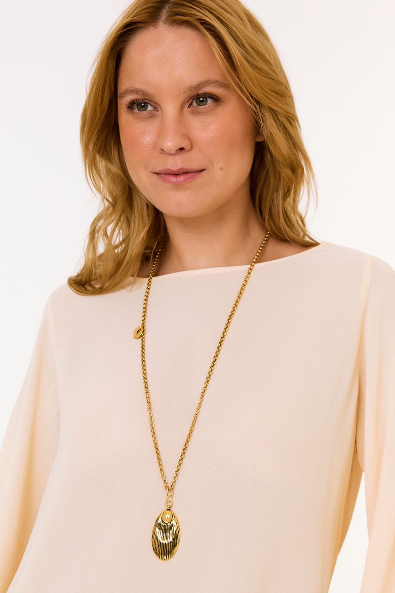 - Pingente em concha com textura gravada que reflete luz com sutileza.