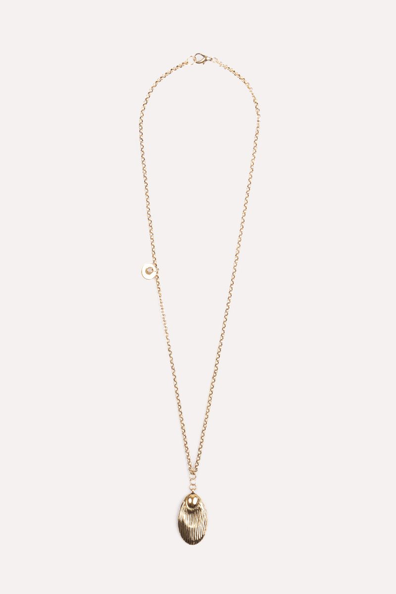 Colar Corrente Concha valoriza qualquer look com seu pingente em forma de concha em metal dourado, trazendo referência natural e sutil ao fisherman core. A corrente longilínea permite sobreposição e realça decotes de tecidos fluidos, combinando com peças que seguem o mood solar e feminino da temporada.