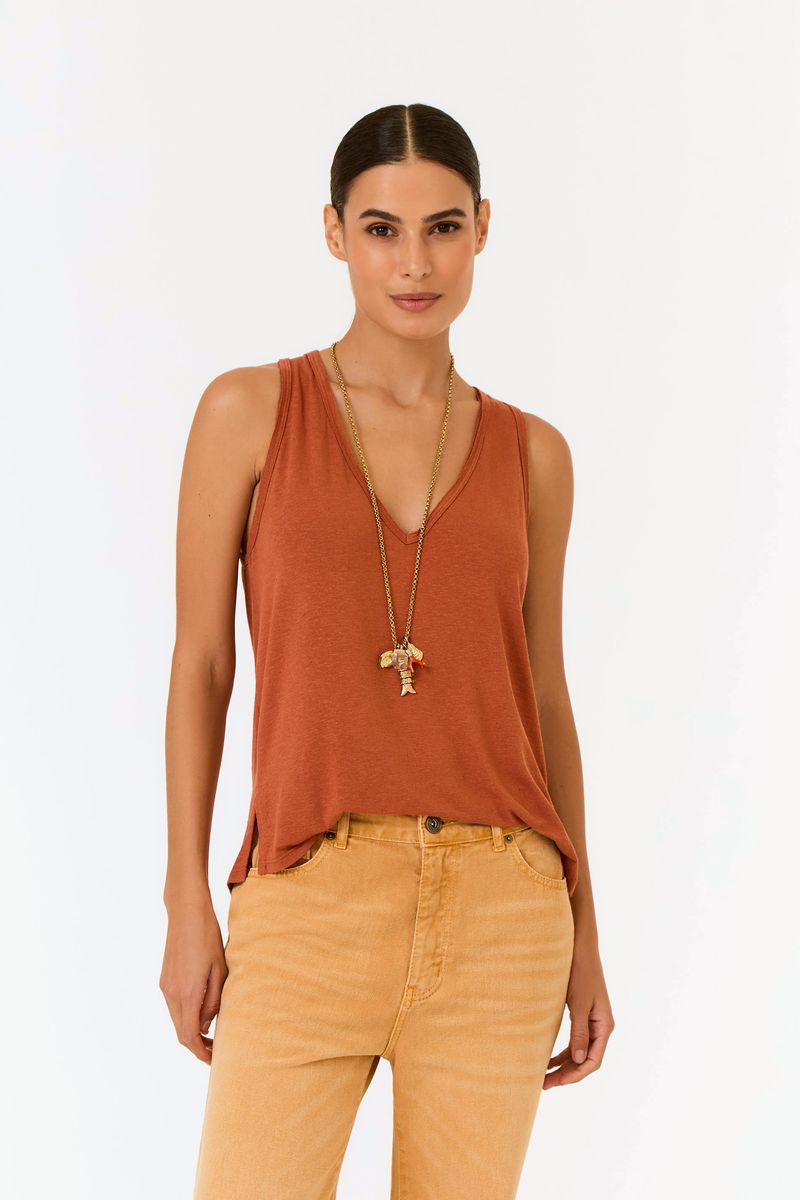 Regata Decote V Fendas valoriza o colo e cria leve movimento com as fendas laterais, oferecendo caimento fluido e liberdade. A modelagem equilibrada funciona como base para combinações que misturam texturas naturais e contrastes de volume.