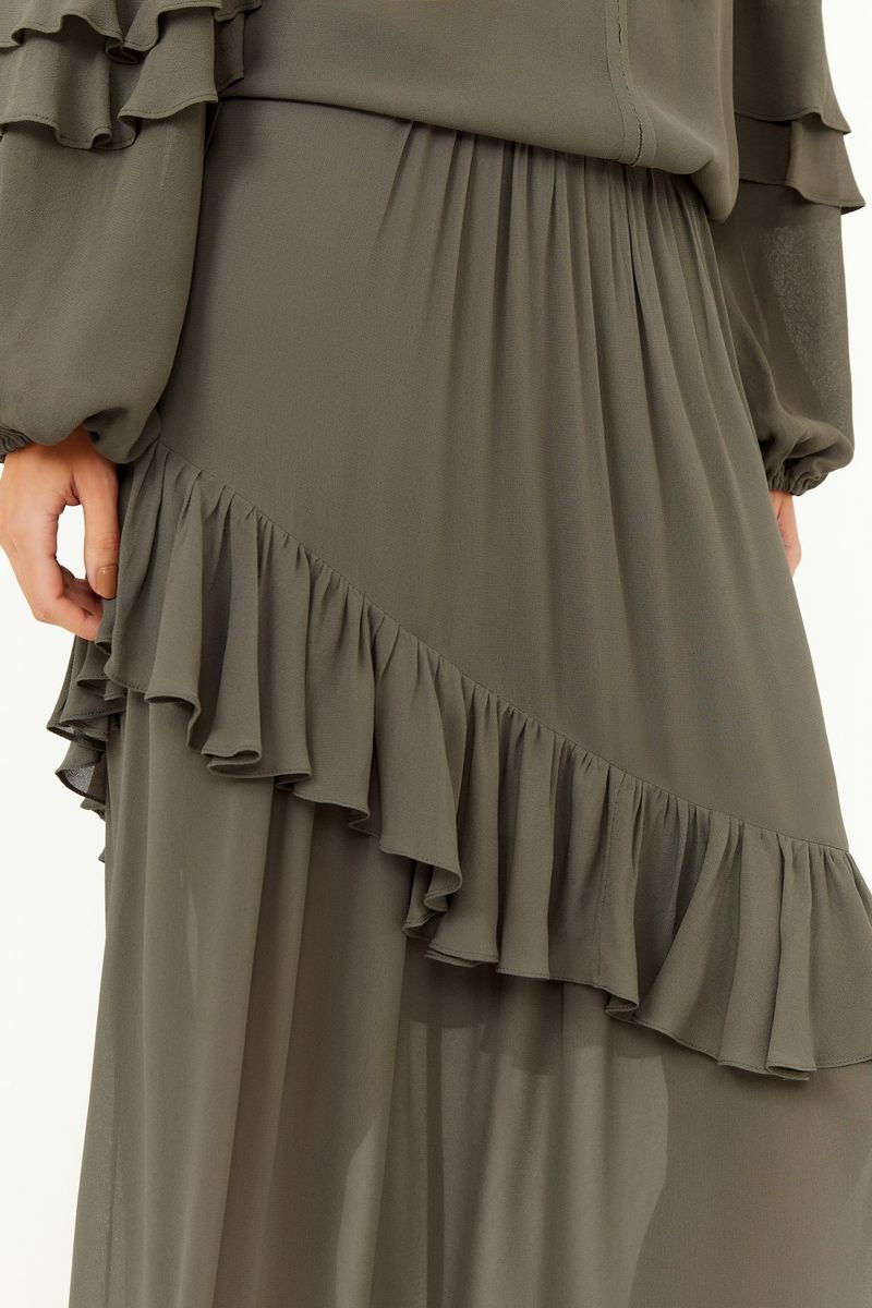 Saia Midi GGT Babados traduz a leveza da temporada em uma silhueta fluida que acompanha o movimento com naturalidade. Confeccionada em GGT 100% viscose, apresenta caimento amplo e toque fresco, com transparência moderada equilibrada pelo forro curto em poliéster, garantindo segurança sem comprometer a fluidez. O cós drapeado com rolotê valoriza a cintura com ajuste delicado, enquanto o zíper lateral invisível mantém o acabamento limpo. Os babados aplicados em recortes estratégicos criam ritmo e profundidade à peça, reforçando a força suave do feminino em uma proposta atemporal e easy-chic. Ideal para composições que pedem elegância leve e presença sutil, é uma saia midi feminina que se destaca pelo design autoral e pelo movimento marcante.