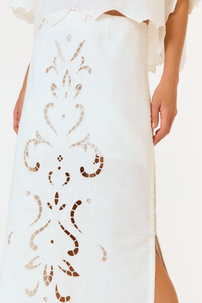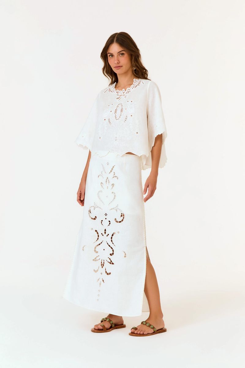 • Tecido 100% linho plano liso • Bordado richelieu frontal • Fendas laterais • Modelagem reta • Comprimento midi • Forro curtoDicas de styling