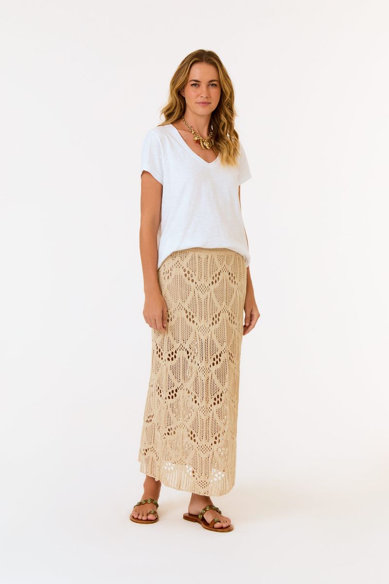 Saia Tricot Midi Ponto Rendado resgata o espírito fisherman core com pontos rendados que lembram a areia da praia, valorizam o artesanato e convidam ao movimento livre. O corte reto define a silhueta e o forro leve garante conforto e caimento fluido, ideal para composições que unem frescor e presença atemporal.