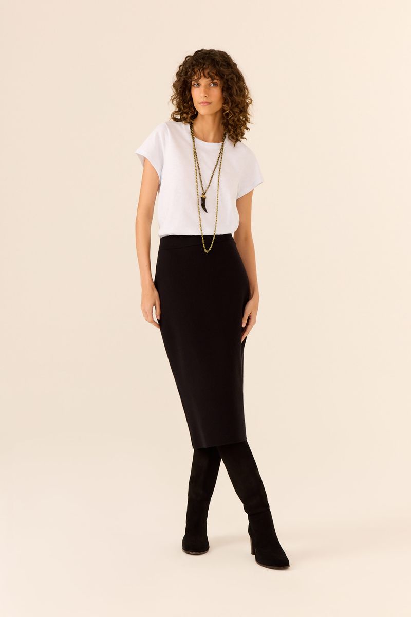A Saia Tricot Midi Reta combina conforto e sofisticação em uma peça versátil e atemporal. Confeccionada em uma mistura de fibras que garantem toque macio e caimento impecável, é perfeita para composições elegantes. Sua modelagem reta valoriza o corpo, tornando-se uma escolha prática para diferentes ocasiões.