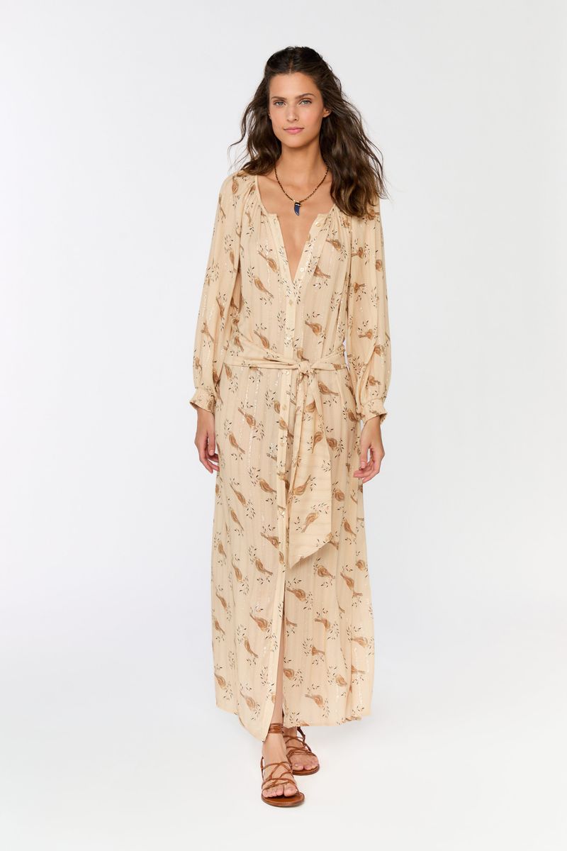 O Vestido Chemise Estampa Sunny traz a leveza do verão em uma peça versátil e cheia de poesia. Confeccionado em viscose com fios de lurex delicados, une frescor e brilho sutil para iluminar o visual. A modelagem chemise conta com abotoamento frontal e lastex nos punhos, que criam volume elegante nas mangas. O decote com leve drapeado valoriza a silhueta, enquanto a faixa solta permite diferentes amarrações, tornando a peça ainda mais prática e adaptável. Atemporal e sofisticado, traduz o espírito easy-chic da Maria Filó em produções que transitam entre dia e noite.