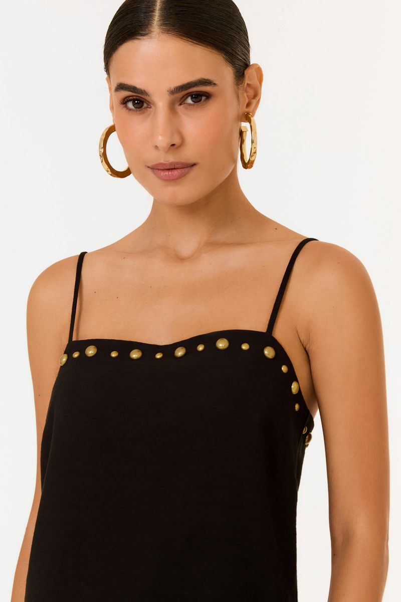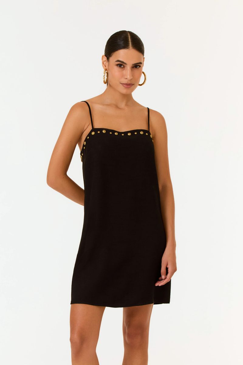 O Vestido Curto Decote Tachas traz um caimento fluido que proporciona conforto e leveza, ideal para quem busca praticidade com sofisticação. As tachas em ouro velho no decote adicionam um detalhe exclusivo, enquanto as alças reguláveis garantem ajuste perfeito. Com zíper nas costas, a peça combina elegância e versatilidade para composições que transitam com facilidade entre diferentes ocasiões.