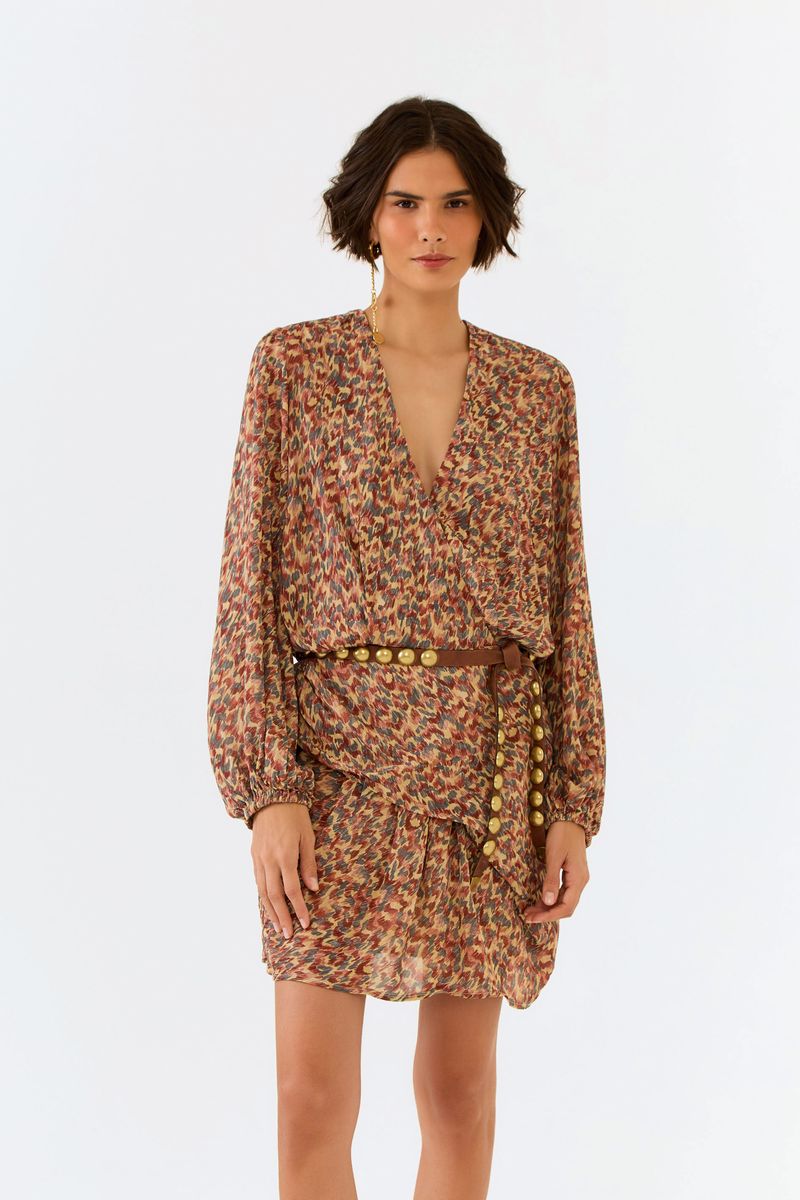O Vestido Curto GGT Estampa Prisma expressa a leveza do verão com caimento fluido e movimento natural. Seu decote V transpassado com botão valoriza o colo, enquanto o elástico na cintura e nos punhos cria uma silhueta equilibrada e confortável. A pala drapeada adiciona textura e elegância à estampa, resultando em uma peça feminina e sofisticada, perfeita para quem busca frescor e versatilidade em uma única criação.