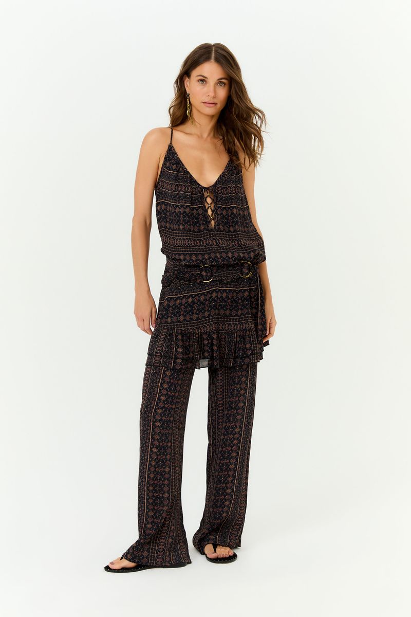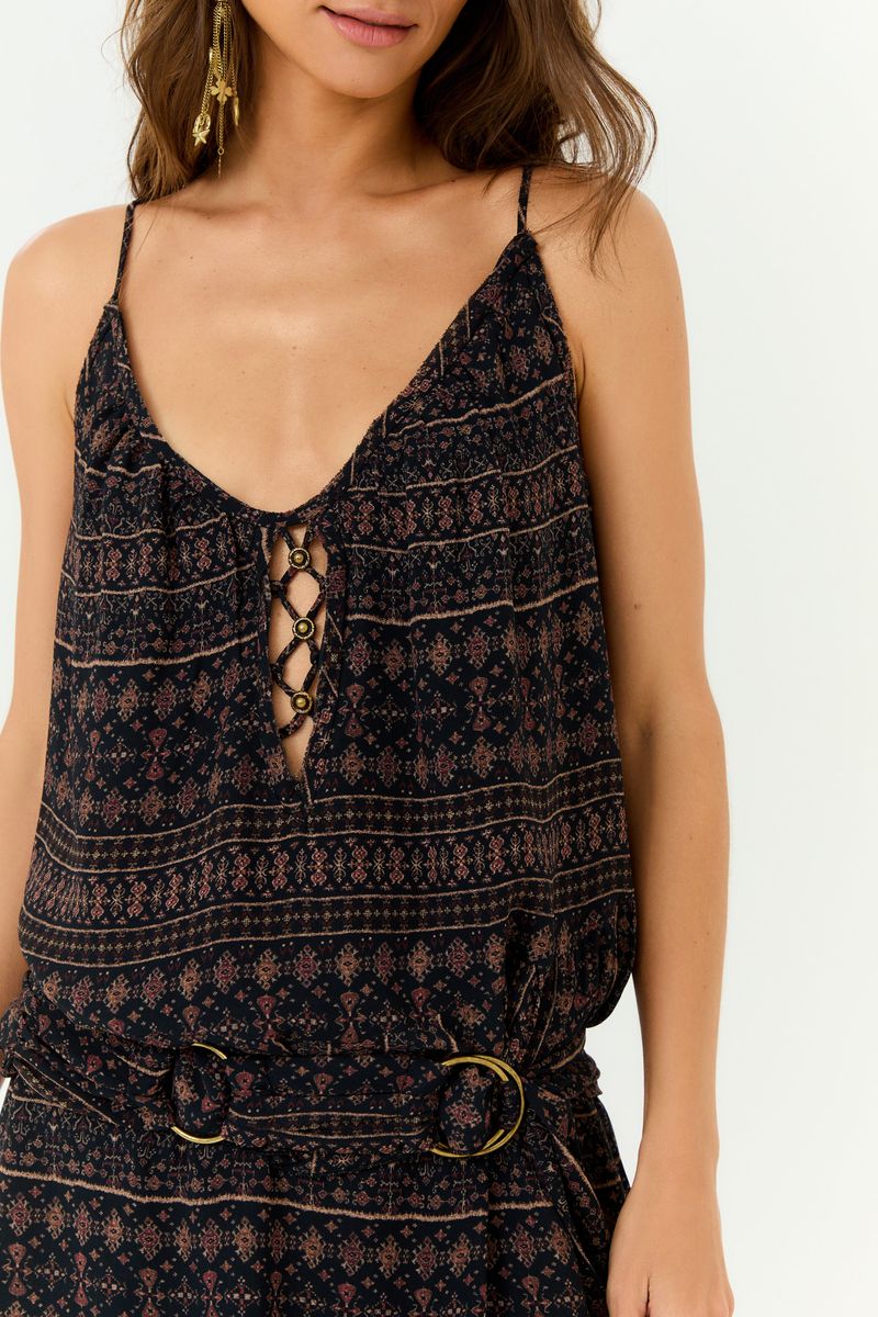O Vestido Curto GGT Metais Estampa Ivy traz uma leitura feminina e sofisticada do boho contemporâneo, combinando leveza, movimento e detalhes que elevam a peça. Confeccionado em GGT, possui caimento fluido e toque delicado, enquanto a estampa Ivy cria profundidade visual com um desenho rico e atemporal. O decote em V com detalhe frontal de amarração é valorizado por aviamentos metalizados exclusivos, desenhados especialmente para a peça, que adicionam charme e identidade ao visual.