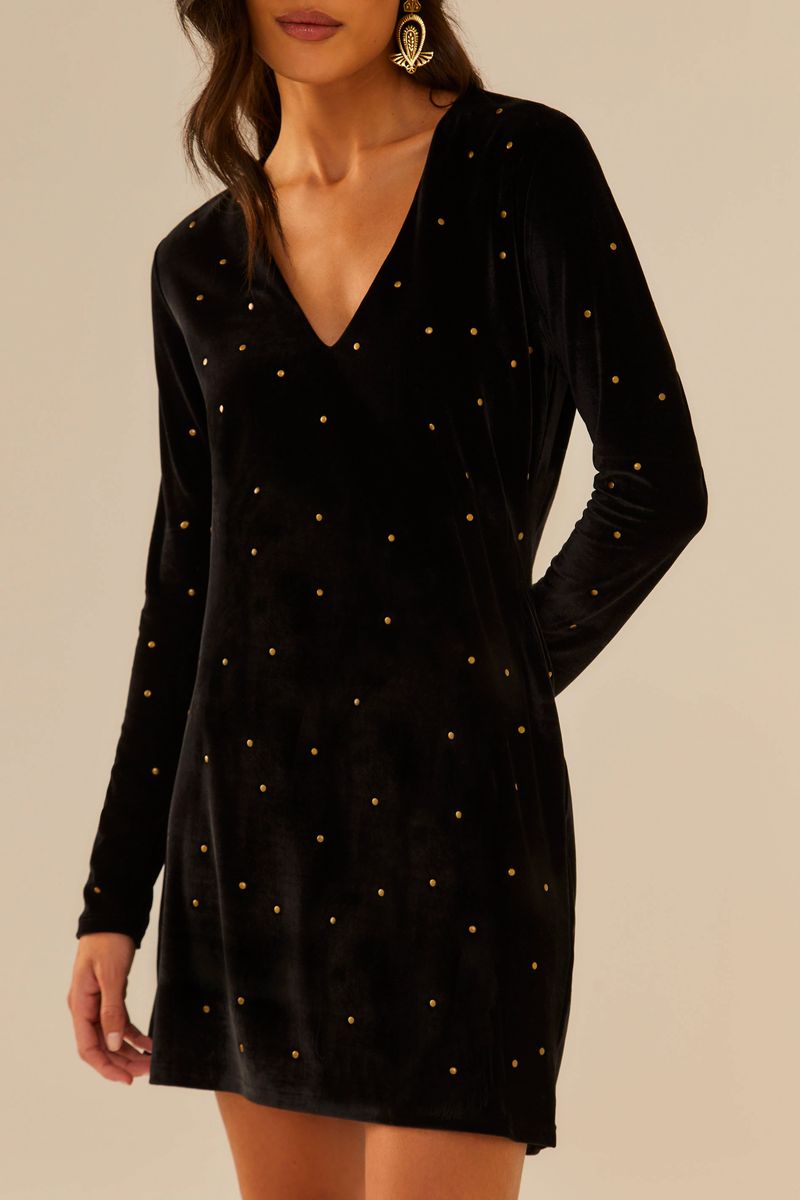 O Vestido Curto Veludo Metais é a escolha perfeita para quem busca sofisticação e estilo. Composto por 96% poliéster e 4% elastano, ele combina conforto e elegância em um só produto. Com mangas longas, decote em V e aplicação de tachas de metal em todo o seu corpo, este vestido é uma peça versátil e atemporal. Para um look noturno, combine com acessórios dourados para iluminar sua produção.