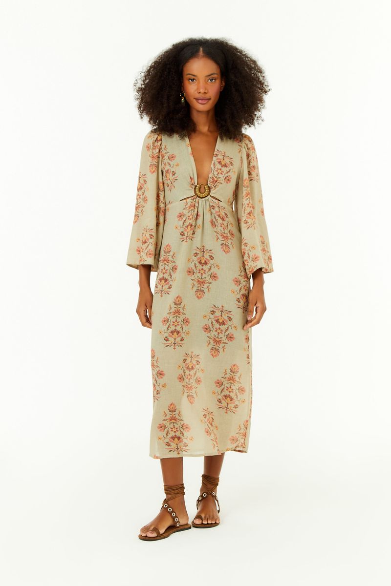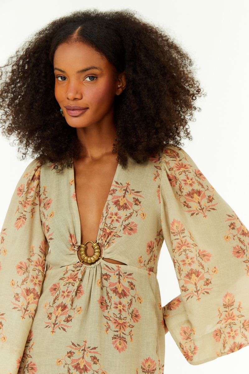 O Vestido Fivela Estampa Pétala traduz feminilidade em um shape midi que une sofisticação e naturalidade. O tecido encorpado com leve transparência valoriza o caimento, enquanto a fivela metalizada no decote cria um ponto de luz especial. A estampa floral em tons delicados conecta-se às tendências de referências botânicas revisitadas, trazendo frescor atemporal para o guarda-roupa.
