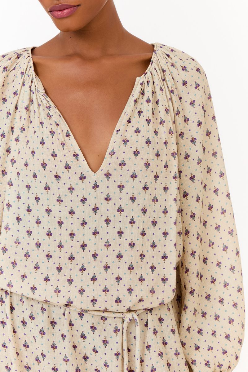- Decote em V com detalhe drapeado nos ombros