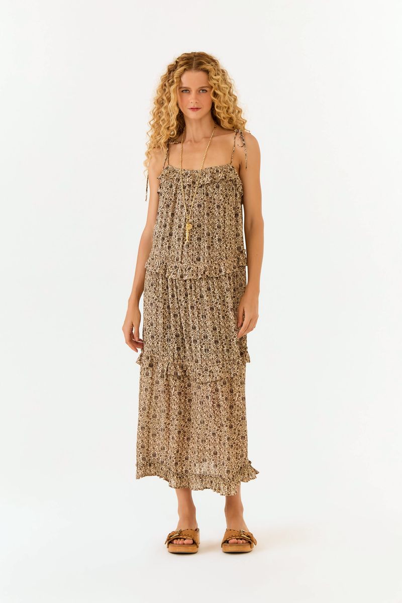 O Vestido Midi Estampa Gerânio traz o frescor da estação com sua modelagem fluida e movimento leve. A estampa exclusiva de flores ganha um brilho sutil com fios de lurex, que iluminam o tecido e acrescentam delicadeza sofisticada. O modelo possui alças ajustáveis por amarração, que além de funcionais reforçam o charme da peça. O forro interno garante conforto e segurança no vestir, enquanto as camadas em babados imprimem naturalidade e fluidez ao visual. Uma peça pensada para acompanhar momentos especiais do dia à noite, sempre com o DNA easy-chic da Maria Filó.