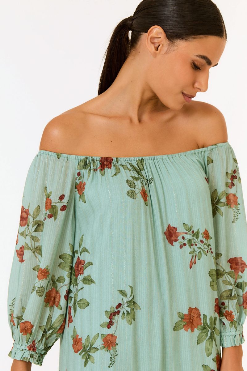 O Vestido Midi Estampa Zínia é a tradução do frescor com charme. Com modelagem ombro a ombro e mangas com elástico, valoriza o colo com leveza. A estampa floral com fios de lurex confere brilho delicado, enquanto o forro interno garante conforto em todos os momentos. Ideal para compor produções sofisticadas sem esforço, com caimento fluido e toque easy-chic.