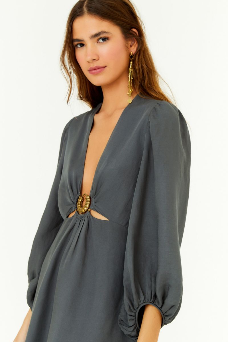O Vestido Midi Fivela Decote é a união entre sofisticação e naturalidade, pensado para valorizar a silhueta com leveza. O decote profundo, arrematado por uma fivela central, cria um ponto de destaque elegante que equilibra personalidade e fluidez. As mangas bufantes com elástico no punho adicionam movimento e presença, enquanto a modelagem ampla garante conforto em diferentes ocasiões. Confeccionado em viscose e linho, o tecido oferece frescor, estrutura e elegância natural, reforçando o caráter atemporal da peça. O forro curto assegura segurança sem comprometer a leveza, tornando este vestido uma escolha versátil para acompanhar do dia à noite.