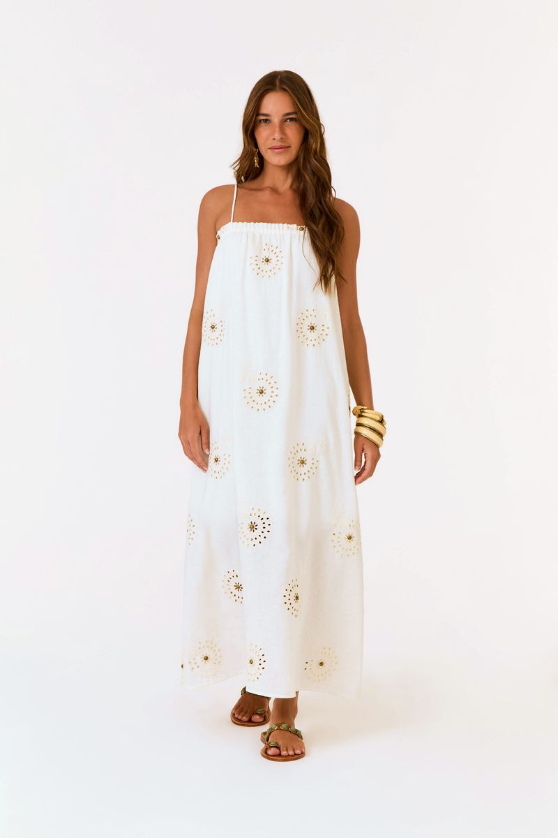 Vestido Midi Laise Tachas mescla leveza e personalidade com busto franzido, alças finas reguláveis, laise bordado aplicado com tachas e forro curto que valoriza a transparência sutil.