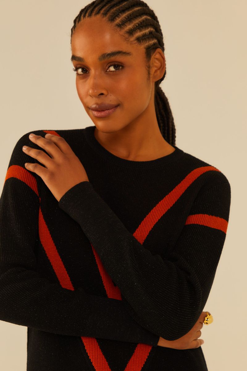 - O tricot intarsia com detalhes em lurex adiciona um toque sofisticado e glamouroso à peça.