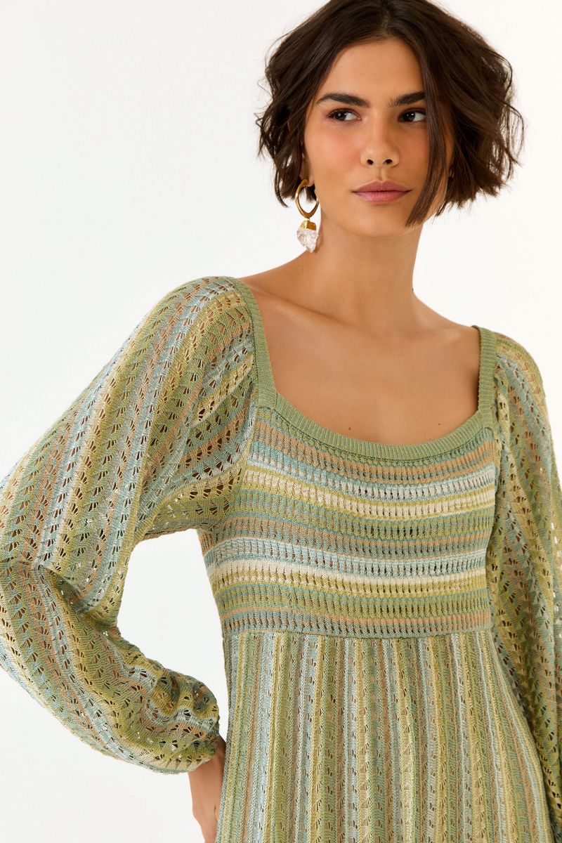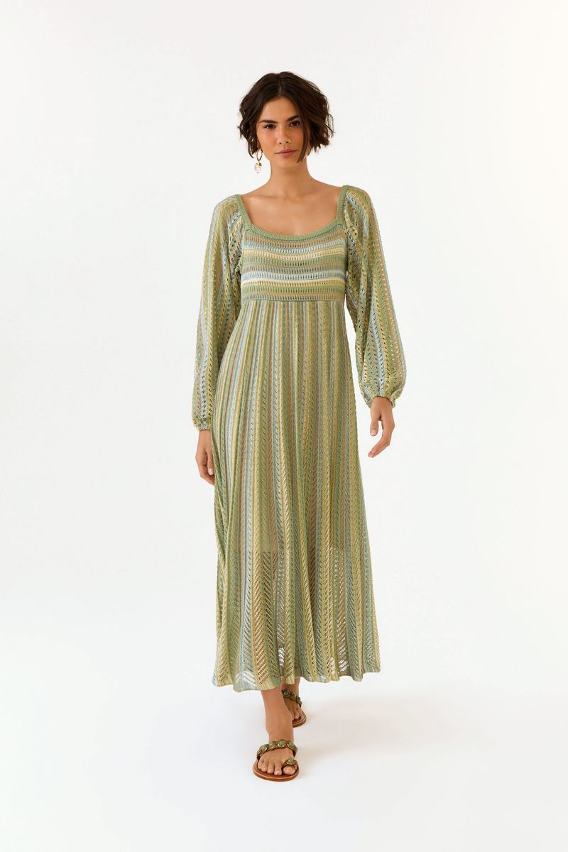 O Vestido Tricot Lastex Ponto Listras combina textura artesanal e caimento fluido em um visual que traduz a leveza da temporada. Com decote quadrado e lastex na cintura, valoriza a silhueta com conforto, enquanto a saia com movimento sutil reforça o espírito easy-chic da coleção. Um clássico repaginado com frescor e autenticidade.